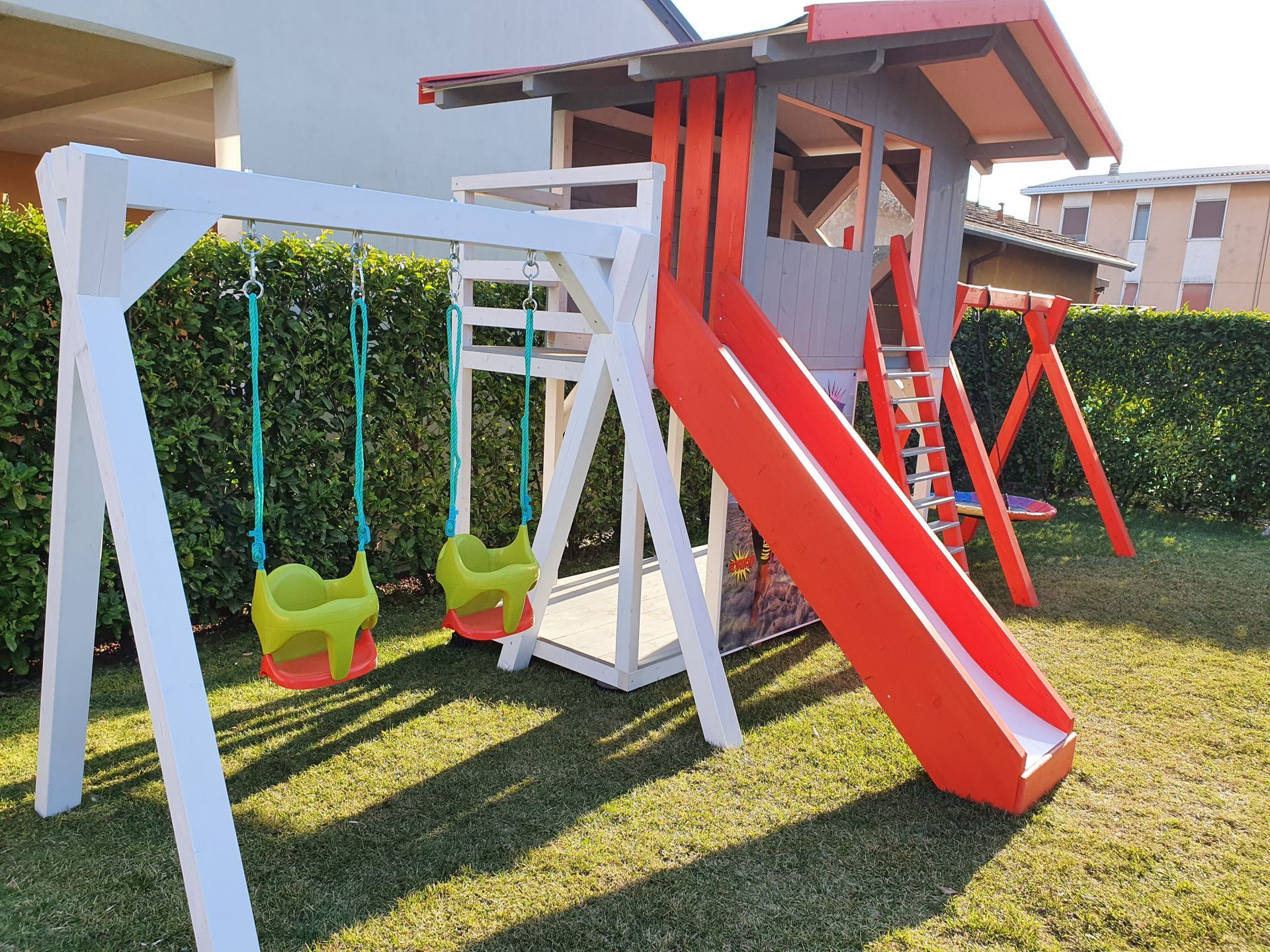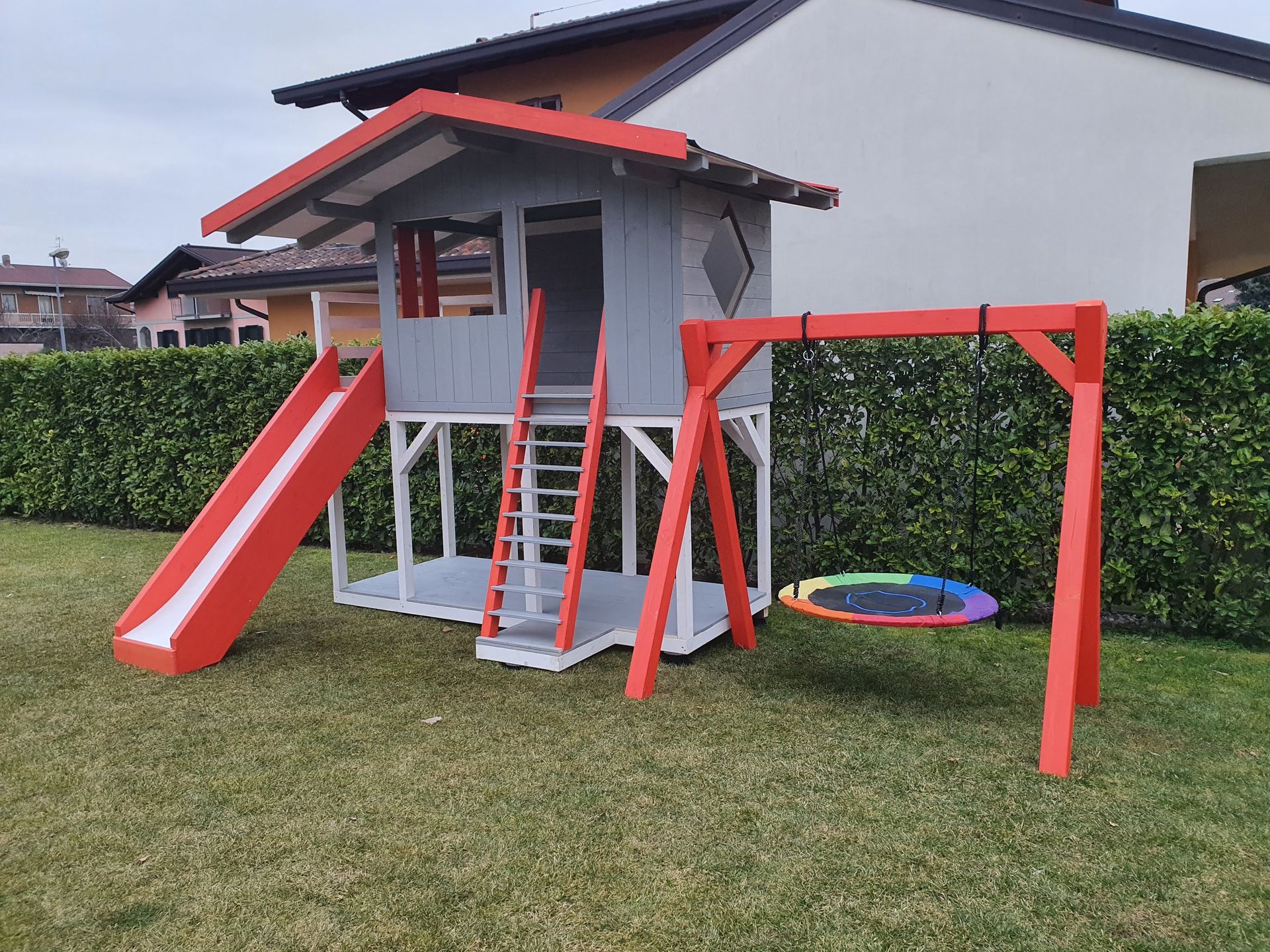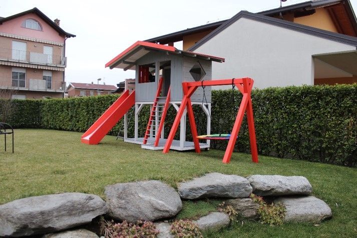 La casetta sopraelevata è facilmente accessibile tramite una comoda scaletta e dispone di un ampio spazio dove i bambini possono giocare, inventare storie e vivere piccole avventure. Lo scivolo frontale permette discese divertenti e sicure, mentre la struttura laterale con altalene offre ancora più possibilità di gioco: due altalene classiche e una pratica altalena basket perfetta per dondolarsi e rilassarsi.
